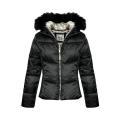 Giubbotto Essenza da bambina a tinta unita in colorazione nero con classico logo in metallo sulla manica. Modello con ampio cappuccio con pelliccia, maniche lunghe con polsini, chiusura sul davanti con zip e fondo con orlo dritto.