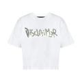 T-shirt Disclaimer da donna a tinta unita in colorazione bianco con classico logo del brand sul davanti in contrasto di colore glitterata. Modello con taglio corto, maniche corte, fondo con orlo dritto e tessuto in cotone.