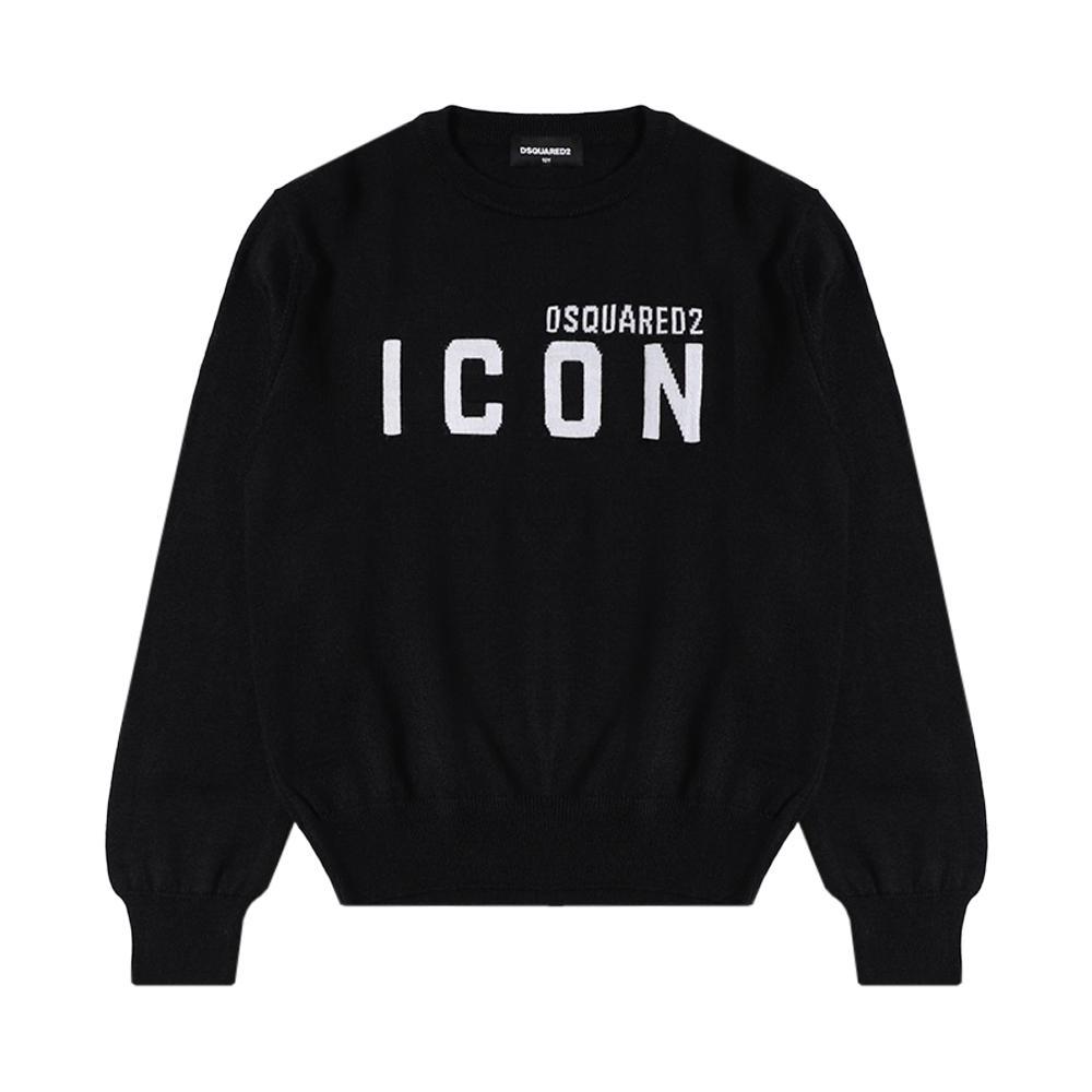 Maglia Dsquared da bambino a tinta unita in colorazione nero con classico logo del brand sul davanti in contrasto di colore. Modello girocollo con bottoni laterali, maniche lunghe, fondo con orlo dritto, molla elastica e tessuto in misto lana.