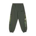Pantafelpa Myar da bambino a tinta unita in colorazione verde militare con classica stampa del brand sulla gamba in contrasto di colore e dettagli laterali con fantasia mimetica. Modello con molla elastica in vita, comode tasche laterali e fondo con polsini alle caviglie. Tessuto in cotone.
