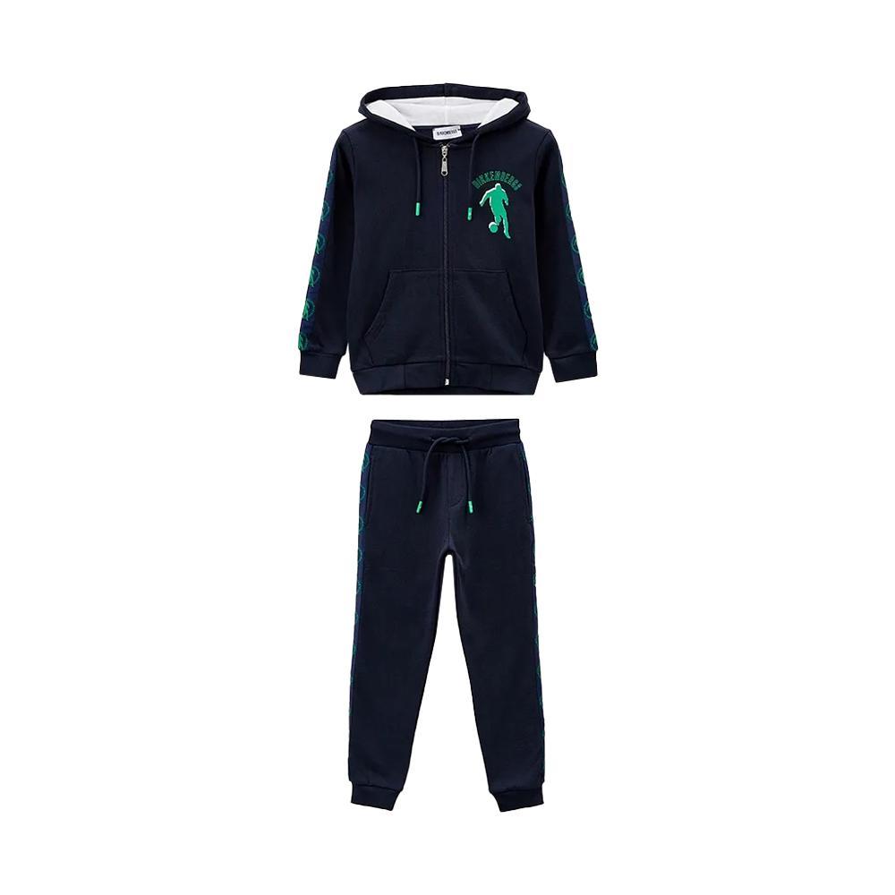 Completo Bikkembergs da bambino a tinta unita in colorazione blu con classico logo del brand sul petto e dettaglio con bande sulle maniche con scritte all'interno. Modello con felpa con ampio cappuccio, chiusura sul davanti con cerniera, maniche lunghe e fondo con orlo dritto. Pantafelpa con molla elastica in vita, comode tasche laterali e fondo con polsini alle caviglie.