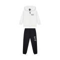 Tuta Ea7 da bambino in colorazione bianco e nero. Modello con felpa con classico logo del brand sul petto in contrasto di colore, cappuccio, chiusura sul davanti con cerniera, maniche lunghe e fondo con orlo dritto. Pantafelpa con molla elastica in vita, comode tasche laterali e fondo con polsini alle caviglie.