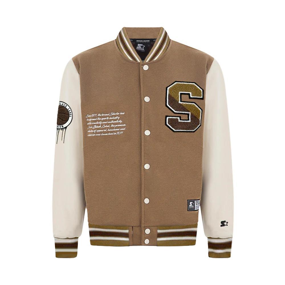 Giubbotto Starter da uomo in colorazione beige con manica in contrasto con toppe e scritte del brand su tutto il capo in contrasto di colore. Modello giacca college con classico colletto, maniche lunghe con polsini, chiusura sul davanti con bottoni a pressione, fondo con orlo dritto e molla elastica in vita.