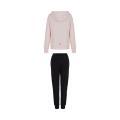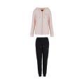 Tuta Ea7 da donna in colorazione rosa e nero. Modello con classico logo del brand sul petto in contrasto, cerniera sul davanti, cappuccio, maniche lunghe con polsini, tasche laterali e fondo con orlo dritto. Pantafelpa con logo sulla gamba, molla elastica in vita e fondo con polsini alle caviglie. Tessuto in misto poliestere.