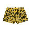 Boxer mare Dsquared da bambino in colorazione giallo con scritte e stampe su tutto il capo in contrasto di colore. Modello con molla elastica in vita e comode tasche laterali. Tessuto in poliestere.