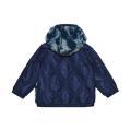 Giubbotto Diesel da neonato in colorazione blu con fantasie su davanti e parte trapunte sulle maniche e sul retro. Modello con ampio cappuccio, chiusura sul davanti con cerniera, maniche lunghe e fondo con orlo dritto. Tessuto in poliestere.