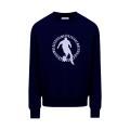 Felpa Bikkembergs da uomo a tinta unita in colorazione blu con stampa del brand sul davanti e logo sulla manica in contrasto di colore. Modello girocollo, maniche lunghe con polsini, fondo con orlo dritto e molla elastica in vita.