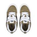 Scarpe Vans da bambino a tinta unita in colorazione verde oliva con classico logo del brand posto lateralmente in contrasto di colore. Modello con chiusura con lacci, punta rotonda e suola in gomma. Tomaia in camoscio e logo in pelle.