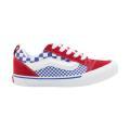 Scarpe Vans da bambino a tinta unita in colorazione rosso e blu con pattern a quadri e classico logo del brand posto lateralmente in contrasto di colore. Modello con chiusura con lacci, punta rotonda e suola in gomma. Tomaia in camoscio e logo in pelle.