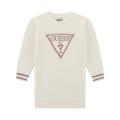 Abito Guess da bambina a tinta unita in colorazione bianco con classico logo del brand sul davanti in contrasto di colore. Modello girocollo, maniche lunghe con polsini e fondo con orlo dritto. Tessuto in misto Poliammide.