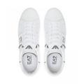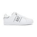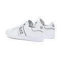 Scarpe Ea7 da bambino a tinta unita in colorazione bianco con classico logo del brand posto lateralmente in contrasto di colore. Modello con lacci, punta rotonda e suola in gomma. Materiale in poliestere.