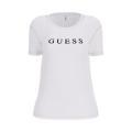 T-shirt Guess da donna a tinta unita in colorazione bianco con scritta del brand posta sul davanti in contrasto di colore. Modello girocollo, maniche corte e fondo con orlo dritto. Tessuto in misto Cotone.