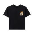 T-shirt Moschino da bambina a tinta unita in colorazione nero con logo del brand posta sul petto in contrasto di colore. Modello girocollo, maniche corte e fondo con orlo dritto. Tessuto in Cotone.
