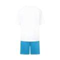 Completo Moschino da bambino in colorazione bianco e turchese. Modello con t-shirt con stampa del brand sul davanti, girocollo, maniche corte e fondo con orlo dritto. Bermuda con molla elastica in vita e logo sulla gamba. Tessuto in cotone.