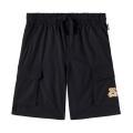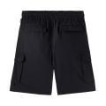Bermuda Moschino da bambino a tinta unita in colorazione nero con logo del brand posto sulla gamba in contrasto di colore. Modello cargo, molla elastica in vita, comode tasche laterali e sulle gambe. Tessuto in misto Cotone.