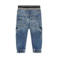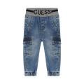 Jeans Guess da bambino con classico lavaggio denim chiaro. Modello cargo, molla elastica in vita con scritta del brand all'interno in contrasto di colore e fondo con polsini alle caviglie. Tessuto in misto Cotone.