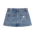 Gonna Guess da bambina con classico lavaggio denim e disegno posto sul davanti in contrasto di colore. Modello con bottoni sul davanti, passa cintura in vita e comode tasche sul retro. Tessuto in Cotone.