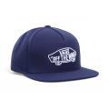 Berretto Vans da bambino a tinta unita in colorazione blu con classico logo del brand posto sul davanti in contrasto di colore. Modello con visiera dritta e linguetta regolabile sul retro. Materiale in Cotone.