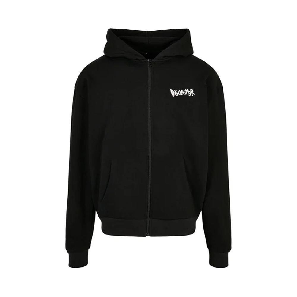 Felpa Disclaimer da bambino a tinta unita in colorazione nero con classico logo del brand sul petto e stampa sul retro in contrasto di colore. Modello con ampio cappuccio, maniche lunghe con polsini, chiusura sul davanti con cerniera, tasche laterali, fondo con orlo dritto e molla elastica in vita. Tessuto in Cotone.