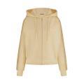 Felpa Guess da donna a tinta unita in colorazione caramello con scritta del brand sul petto e dettagli con bande laterali in contrasto di colore. Modello con ampio cappuccio con lacci, maniche lunghe con polsini, chiusura sul davanti con cerniera, comode tasche laterali, fondo con orlo dritto e molla elastica in vita. Tessuto in misto Cotone.