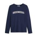 T-shirt Bikkembergs da neonato a tinta unita in colorazione blu scuro con stampa del brand posto sul davanti in contrasto di colore. Modello girocollo, maniche lunghe e fondo con orlo dritto.