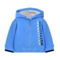 Felpa Bikkembergs da neonato a tinta unita in colorazione cielo con scritta del brand in verticale in contrasto di colore. Modello con ampio cappuccio, chiusura sul davanti con cerniera, maniche lunghe con polsini, fondo con orlo dritto e molla elastica in vita.