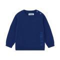 Maglia Bikkembergs da neonato a tinta unita in colorazione blu con classica scritta del brand cucita lateralmente sul fondo in tono su tono. Modello girocollo con chiusura con bottoni laterali, maniche lunghe con polsini, fondo con orlo dritto e molla elastica in vita.