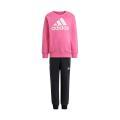 Tuta Adidas da bambina in colorazione fucsia e nero. Modello con felpa con stampa sul davanti in contrasto di colore, girocollo, maniche lunghe con polsini e fondo con orlo dritto. Pantafelpa con molla elastica, logo sulla gamba e fondo con polsini alle caviglie. Tessuto in misto cotone.