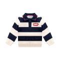 Polo Bikkembergs da neonato in colorazione panna e blu con fantasia a righe orizzontali e scritte sul petto in contrasto di colore. Modello con classico colletto, bottoni sul davanti, maniche lunghe con polsini, fondo con orlo dritto e molle elastica in vita.