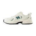 Scarpe New Balance 530 da bambino in colorazione bianco e verde con dettagli su tutto l'articolo e classico logo del brand posto lateralmente in contrasto di colore. Modello con chiusura con stringhe, intersuola ABZORB per attutire impatti e suola in gomma. Tomaia in Tessuto e Similpelle.