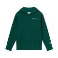 Felpa Champion da bambino a tinta unita in colorazione verde con logo del brand sul petto e loghetto sulla manica in contrasto di colore. Modello con ampio cappuccio, maniche lunghe con polsini, tasca marsupio sul davanti, fondo con orlo dritto e molla elastica in vita. Tessuto in misto Cotone.