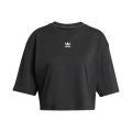 T-shirt Adidas da donna a tinta unita in colorazione nero con logo del brand sul davanti in contrasto di colore. Modello con taglio corto, girocollo, maniche corte e fondo con orlo dritto. Tessuto in Cotone.