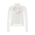 T-shirt Gaudi da donna a tinta unita in colorazione bianco con scritta del brand posta sul davanti realizzato con brillantini in contrasto di colore. Modello mezzo collo, maniche lunghe e fondo con orlo dritto. Tessuto in misto Viscosa.