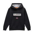Felpa Napapijri da bambino a tinta unita in colorazione nero con logo del brand sul davanti in contrasto di colore. Modello con ampio cappuccio, maniche lunghe con polsini, fondo con orlo dritto e molla elastica in vita. Tessuto in misto cotone.