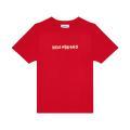 T-shirt Bikkembergs da bambino a tinta unita in colorazione rubino con stampa del brand sul davanti in contrasto di colore. Modello girocollo, maniche corte e fondo con orlo dritto.