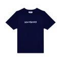 T-shirt Bikkembergs da bambino a tinta unita in colorazione blu con stampa del brand sul davanti in contrasto di colore. Modello girocollo, maniche corte e fondo con orlo dritto.