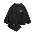 Tuta Adidas da neonato a tinta unita in colorazione nero. Modello con felpa con classico logo del brand sul petto in contrasto di colore, girocollo con bottoni laterali, maniche lunghe e fondo con orlo dritto. Pantafelpa con  logo posto sulla gamba in contrasto di colore, molla elastica in vita e polsini alle caviglie. Tessuto in misto cotone.