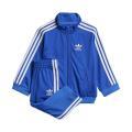 Tuta Adidas da neonato a tinta unita in colorazione royal. Modello con felpa con classico logo del brand sul petto e strisce sulle maniche in contrasto di colore, collo alto, chiusura sul davanti con cerniera, maniche lunghe con polsini e fondo con orlo dritto. Pantafelpa con molla elastica, logo sulla gamba, classiche strisce laterali e fondo con polsini alle caviglie. Tessuto in poliestere.