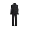 Tuta Adidas da bambino a tinta unita in colorazione nero. Modello con felpa con classico logo del brand sul petto e strisce sulle maniche in contrasto di colore, collo alto, chiusura sul davanti con cerniera, maniche lunghe con polsini e fondo con orlo dritto. Pantafelpa con molla elastica, logo sulla gamba, classiche strisce laterali e fondo con polsini alle caviglie. Tessuto in poliestere.