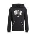 Felpa Adidas da bambino a tinta unita in colorazione nero con scritta del brand stampato sul davanti in contrasto di colore. Modello con ampio cappuccio, maniche lunghe con polsini, tasca marsupio sul davanti, fondo con orlo dritto e molla elastica in vita. Tessuto in mist0 Cotone.