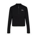 Maglia Guess da donna a tinta unita in colorazione nero con scritta del brand cucita sul petto in contrasto di colore e trama intrecciata su tutto il capo. Modello mezzo collo alto, chiusura con zip sul davanti, maniche lunghe con polsini, fondo con orlo dritto e molla elastica in vita. Tessuto in misto Viscosa.