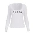 T-shirt Guess da donna a tinta unita in colorazione bianco con classica scritta del brand posta sul davanti in contrasto di colore. Modello con ampio scollo rotondo, maniche lunghe e fondo con orlo dritto. Tessuto in misto Cotone.