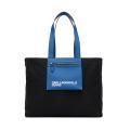 Borsa Karl Lagerfeld da donna in colorazione nero con dettagli in blu e classica scritta del brand posta sul davanti in contrasto di colore. Modello con due manici, tasca sul davanti, ampio scomparto all'interno e chiusura con bottone. Materiale in Tessuto. Dimensione: 39 x 32 x 13 cm.