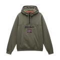 Felpa Napapijri da uomo a tinta unita in colorazione verde militare con classica scritta del brand posta sul davanti in contrasto di colore. Modello con ampio cappuccio, comoda tasca marsupio sul davanti, chiusura con mezza cerniera, maniche lunghe con polsini, fondo con orlo dritto e molla elastica in vita. Tessuto in misto cotone.