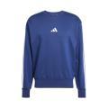 Felpa Adidas da uomo a tinta unita in colorazione blu con classico logo del brand sul davanti e bande laterali sulle maniche in contrasto di colore. Modello girocollo, maniche lunghe con polsini, fondo con orlo dritto e molla elastica in vita. Tessuto in misto cotone.