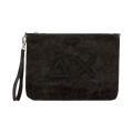Pochette Sun68 da donna a tinta unita in colorazione nero e classico logo del brand posto sul davanti in tono su tono. Modello in velluto con chiusura con cerniera nella parte superiore e laccetto laterale. Tessuto in Poliestere.