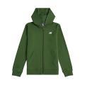 Felpa New Balance da bambino a tinta unita in colorazione verde con classico logo del brand cucito sul petto in contrasto di colore. Modello con ampio cappuccio, chiusura sul davanti con cerniera, comode tasche laterali, fondo con orlo dritto e molla elastica in vita. Tessuto in cotone.