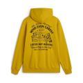 Felpa Vans da uomo a tinta unita in colorazione ocra con stampa del brand posta sul petto e in grande sul retro in contrasto di colore. Modello con ampio cappuccio, tasca marsupio sul davanti, maniche lunghe con polsini, fondo con orlo dritto e molla elastica in vita. Tessuto in misto Cotone.