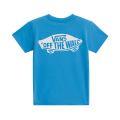 T-shirt Vans da bambino a tinta unita in colorazione cielo con stampa del brand posta sul petto e in grande sul retro in contrasto di colore. Modello girocollo, maniche corte e fondo con orlo dritto. Tessuto in Cotone.