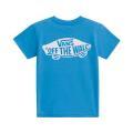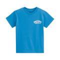 T-shirt Vans da bambino a tinta unita in colorazione cielo con stampa del brand posta sul petto e in grande sul retro in contrasto di colore. Modello girocollo, maniche corte e fondo con orlo dritto. Tessuto in Cotone.